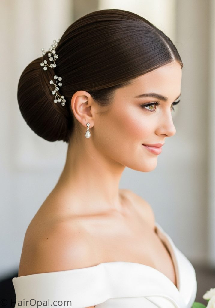 Brush everything back smoothly, apply gel along the hairline and over the surface, gather into a low ponytail at the nape, twist into a flat bun, and pin it firmly in place. Crystal or pearl pins scattered throughout elevate it from simple to genuinely bridal. For more wedding-ready updo inspiration, our updo hairstyles guide has beautiful options worth considering for the big day.