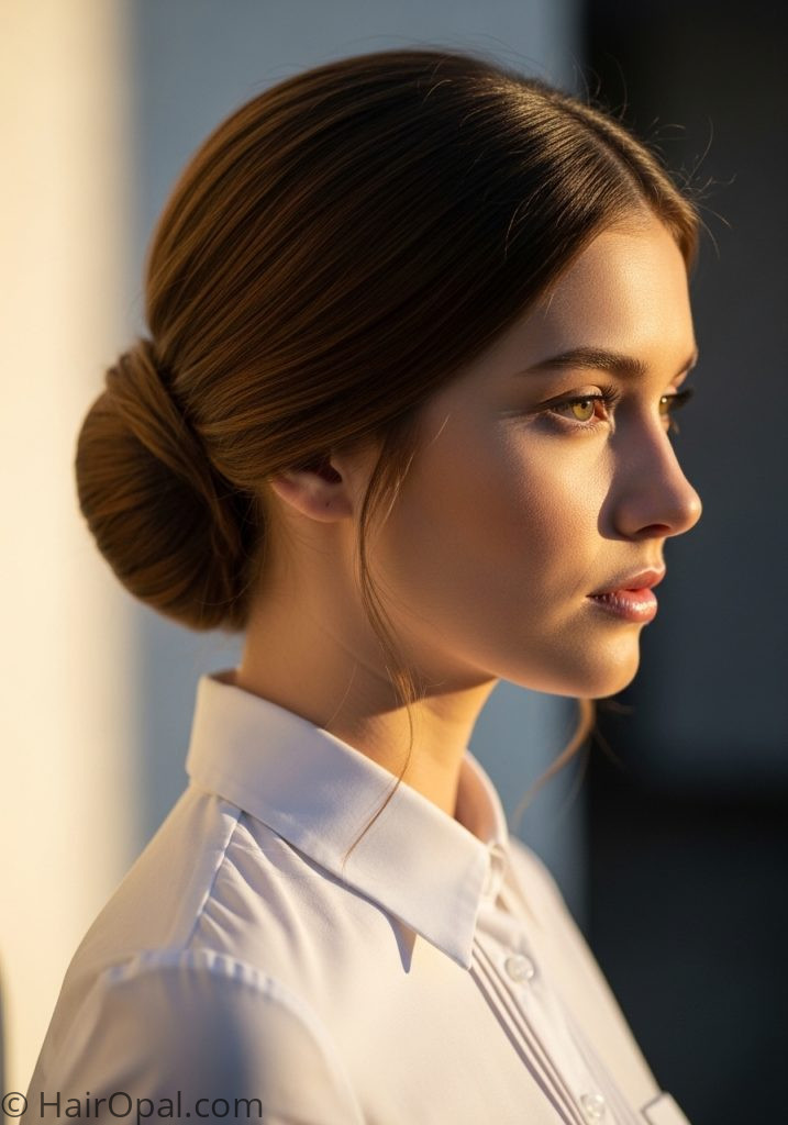 A sleek low bun on straight medium hair is one of the most polished easy hairstyles for school straight hair updo options that takes about three minutes and looks genuinely put together from every angle. Brush everything back, pull into a low ponytail at the nape, twist into a bun, and pin it flat. Pull two small pieces loose at the temples to soften the front.