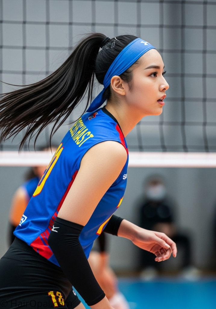 A wide headband at the front catches any shorter pieces or baby hairs that would fall forward during dives and jumps. This is the top choice for easy volleyball hairstyles for long hair because all that length gets completely controlled while the ponytail movement feels free and comfortable during play.