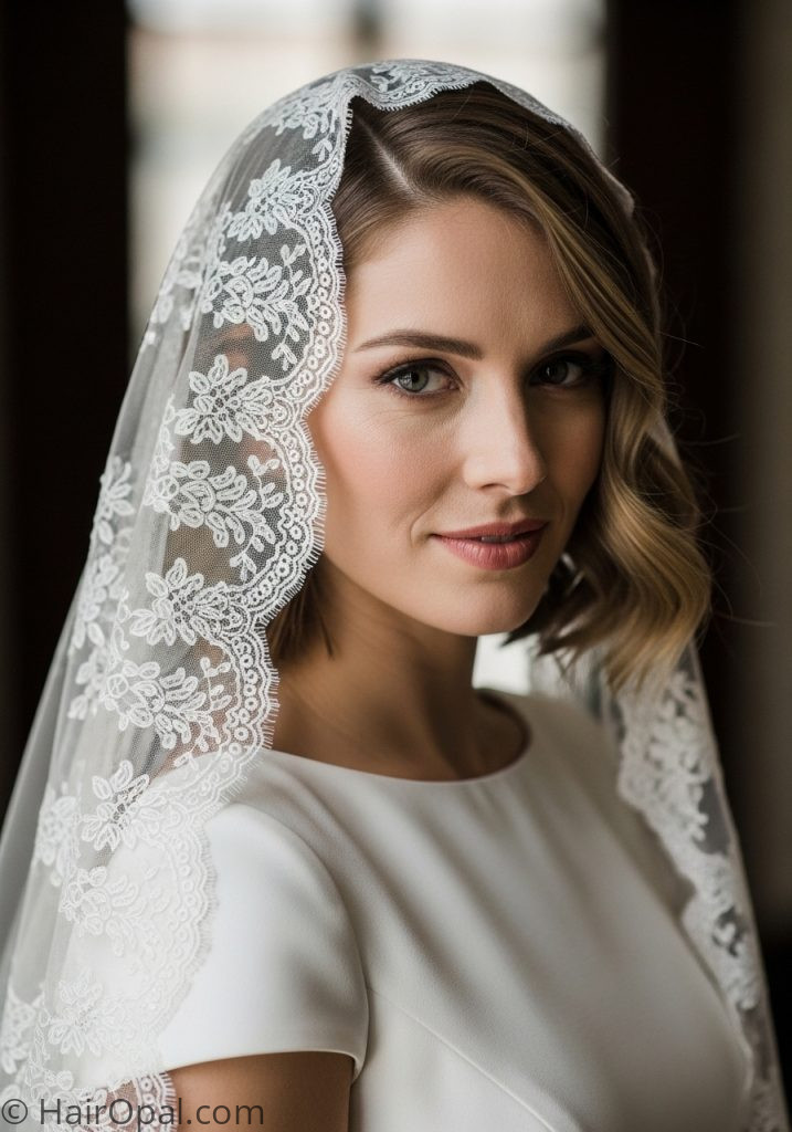 Short hair styled in a vintage wave set under a mantilla is one of the most authentically period-correct mantilla veil hairstyle short combinations because short waved hair and lace mantillas were genuinely worn together in the mid-twentieth century bridal tradition. The soft waves close to the head provide the perfect base for the mantilla to drape over naturally without any height interfering with the placement.